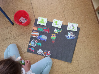 1. Material para clasificar los vehículos de transporte: con pictogramas se representa "conduce" (tierra), "vuela" (aire), "navega" (agua): se realizan tres columnas y se van colocando los vehículos.